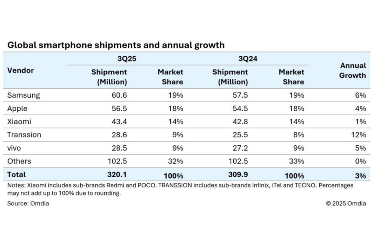 در سهماهه سوم سال ۲۰۲۵، شرکت سامسونگ بار دیگر تاج پرفروشترین برند موبایل جهان را از اپل پس گرفت. بر اساس آمار موسسه IDC، سامسونگ با فروش ۶۰.۶ میلیون گوشی و سهم ۱۹ درصدی از بازار، جایگاه نخست را بهدست آورد؛ در حالی که اپل با فروش ۵۶.۵ میلیون آیفون و سهم ۱۸ درصدی در رتبه دوم قرار گرفت.